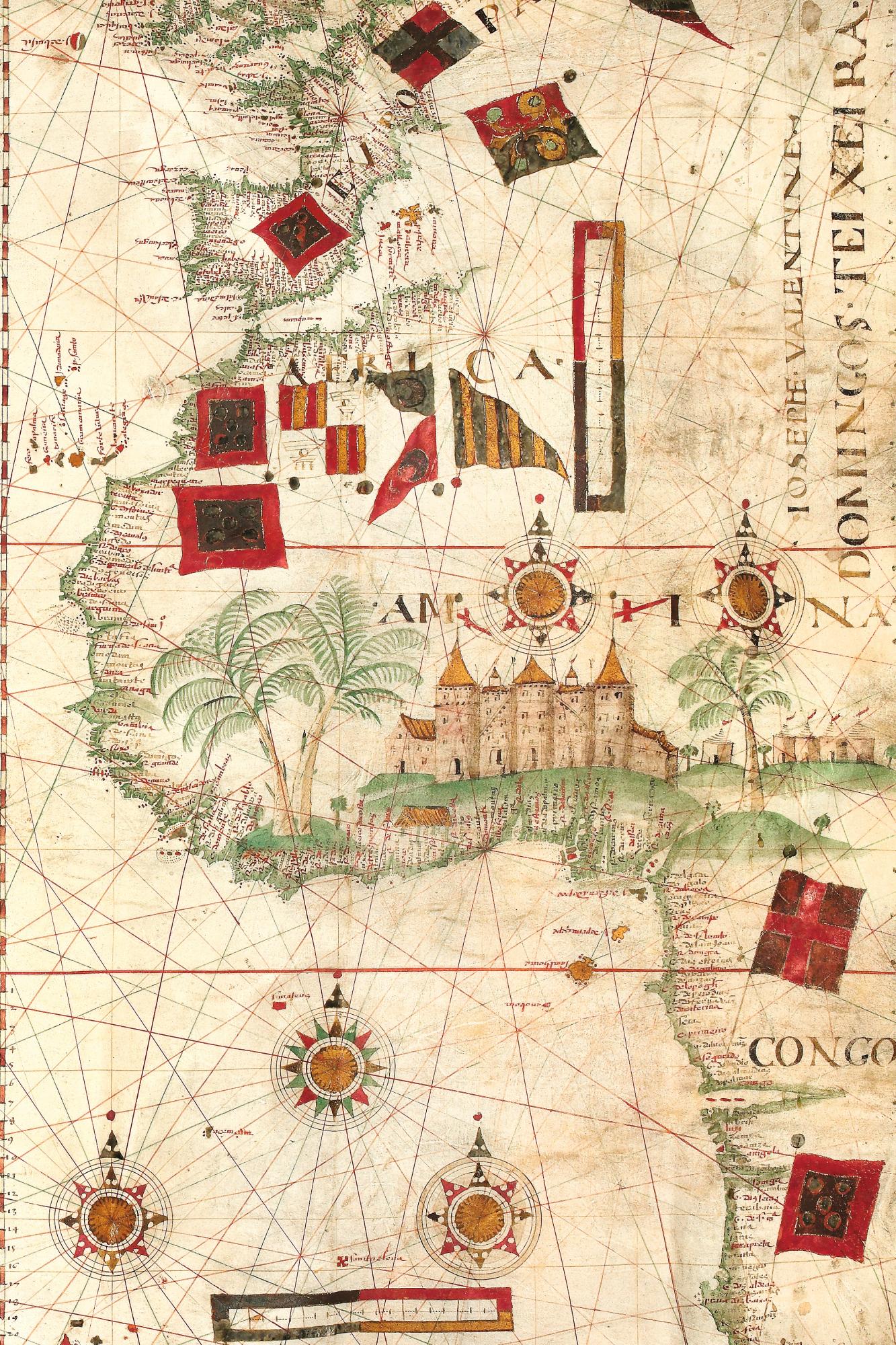 The eastern part of a portolan chart of the Atlantic Ocean, made in Portugal by Domingos Teixeira around 1570. Beautifully hand drawn on parchment, it shows the coasts of Europe and western Africa with remarkable accuracy, with beautiful decorations including flags, comapss roses and a palace surrounded by palm trees in west Africa. [NB will the image be just this section as shown here? The full chart covers the Caribbean and parts of the Americas as well]