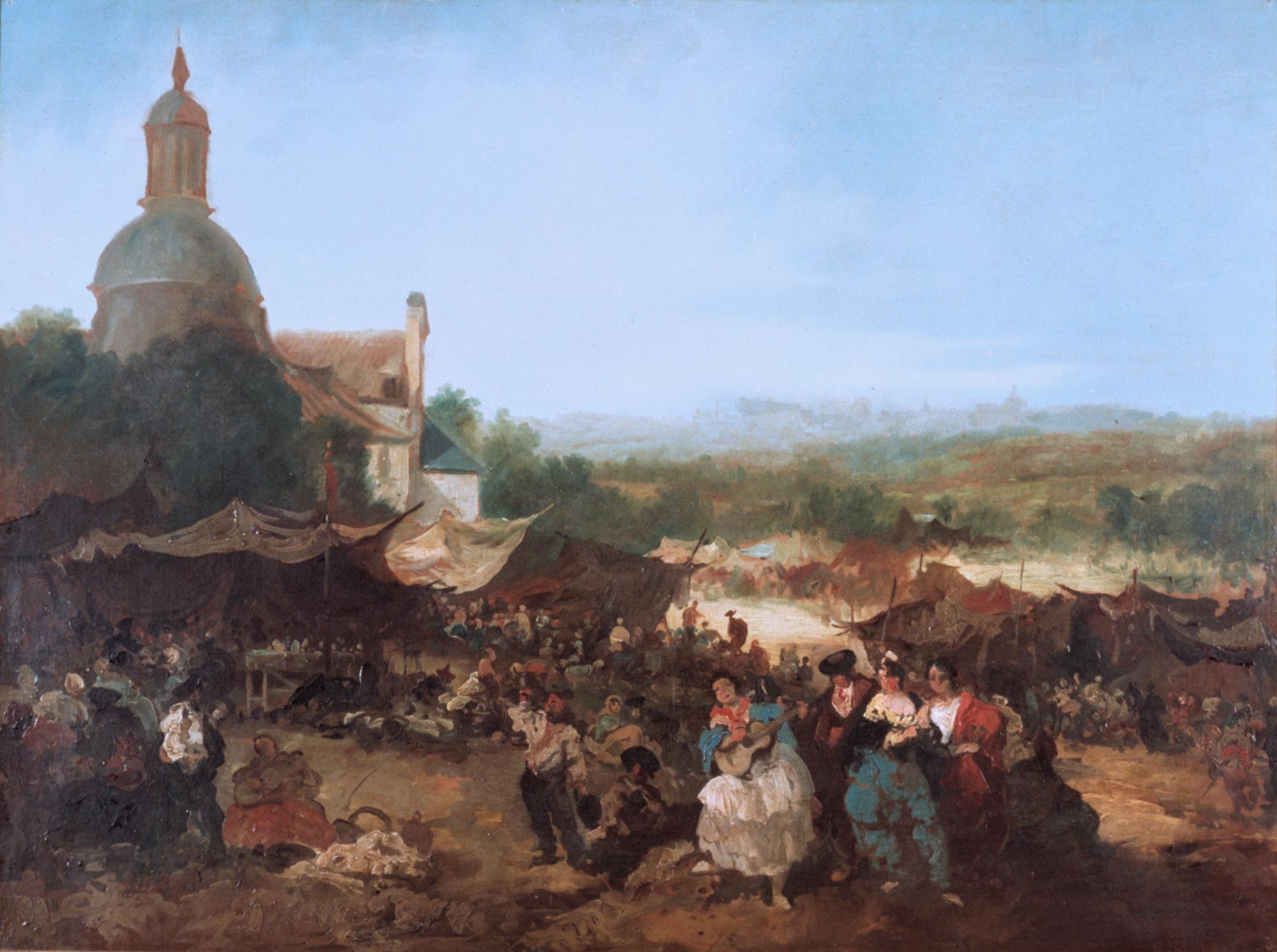 El lienzo nos muestra la pradera de San Isidro con los tenderetes de comestibles y cacharrería, a lo lejos, entre la bruma, la silueta de la facha oeste del Palacio Real de Madrid.