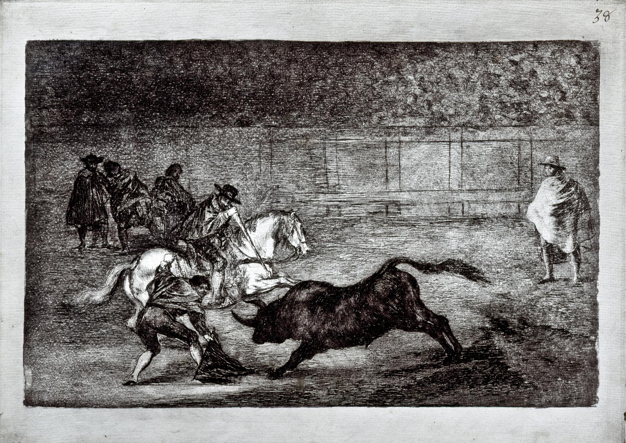 Prueba de estado. Una de las siete composiciones descartadas por Goya para su publicación en 1816, motivo por el que la Tauromaquia está compuesta por 33 estampas en lugar de 40.