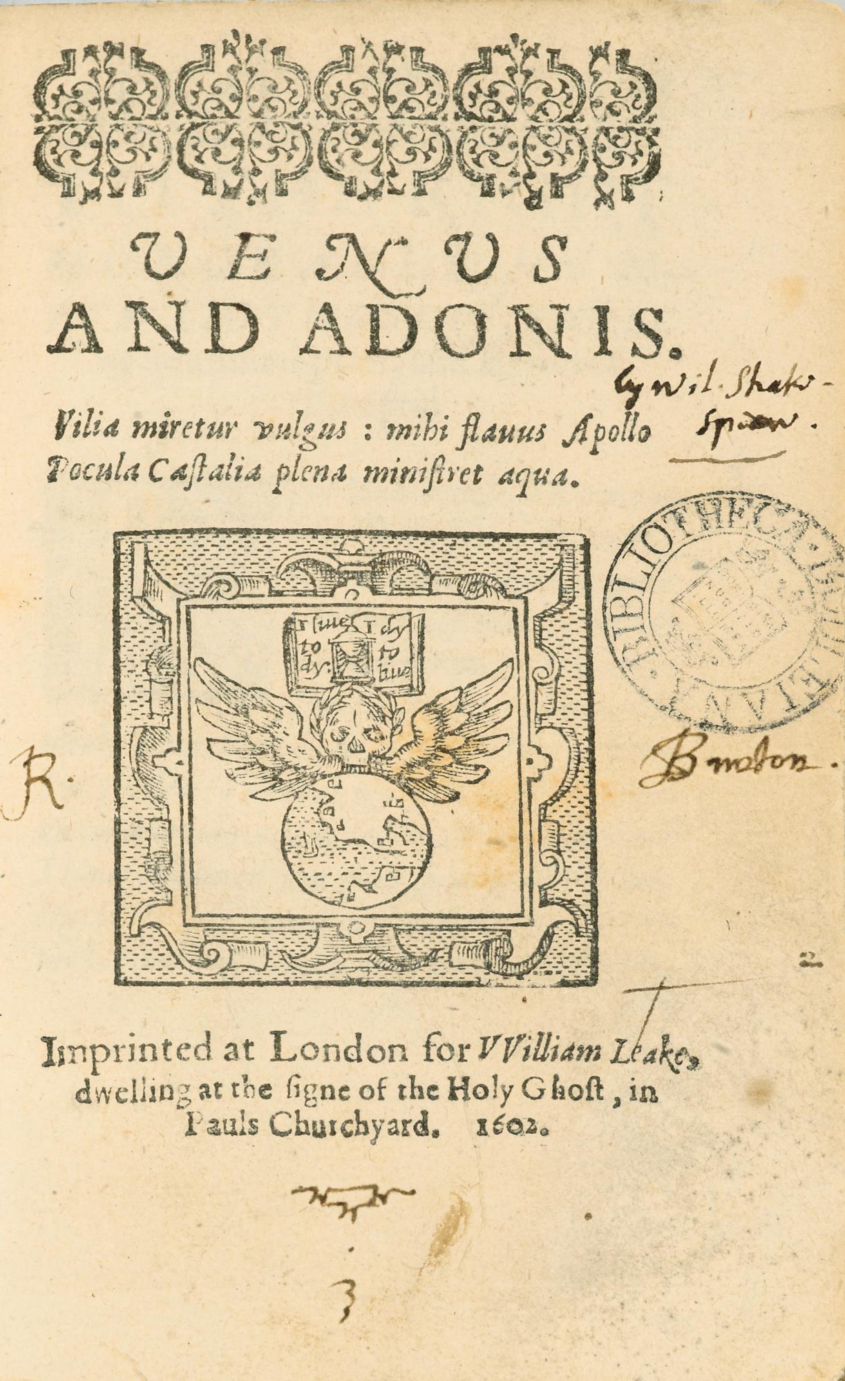 First published in 1593, Venus and Adonis was Shakespeare?s most popular poem, and for this very reason few examples survive; copies were read and re-read, lent and borrowed until they fell apart. At least fifteen further editions were published over the next forty-three years, but for many of them there is only one surviving copy. This copy of Venus and Adonis belonged to Robert Burton, student of Christ Church and author of the Anatomy of Melancholy, whose bequest of books to the Bodleian greatly increased the Library?s scant literary holdings. It purports to be an edition of 1602, but is in fact a pirated edition printed in 1607?8. No other examples are known.