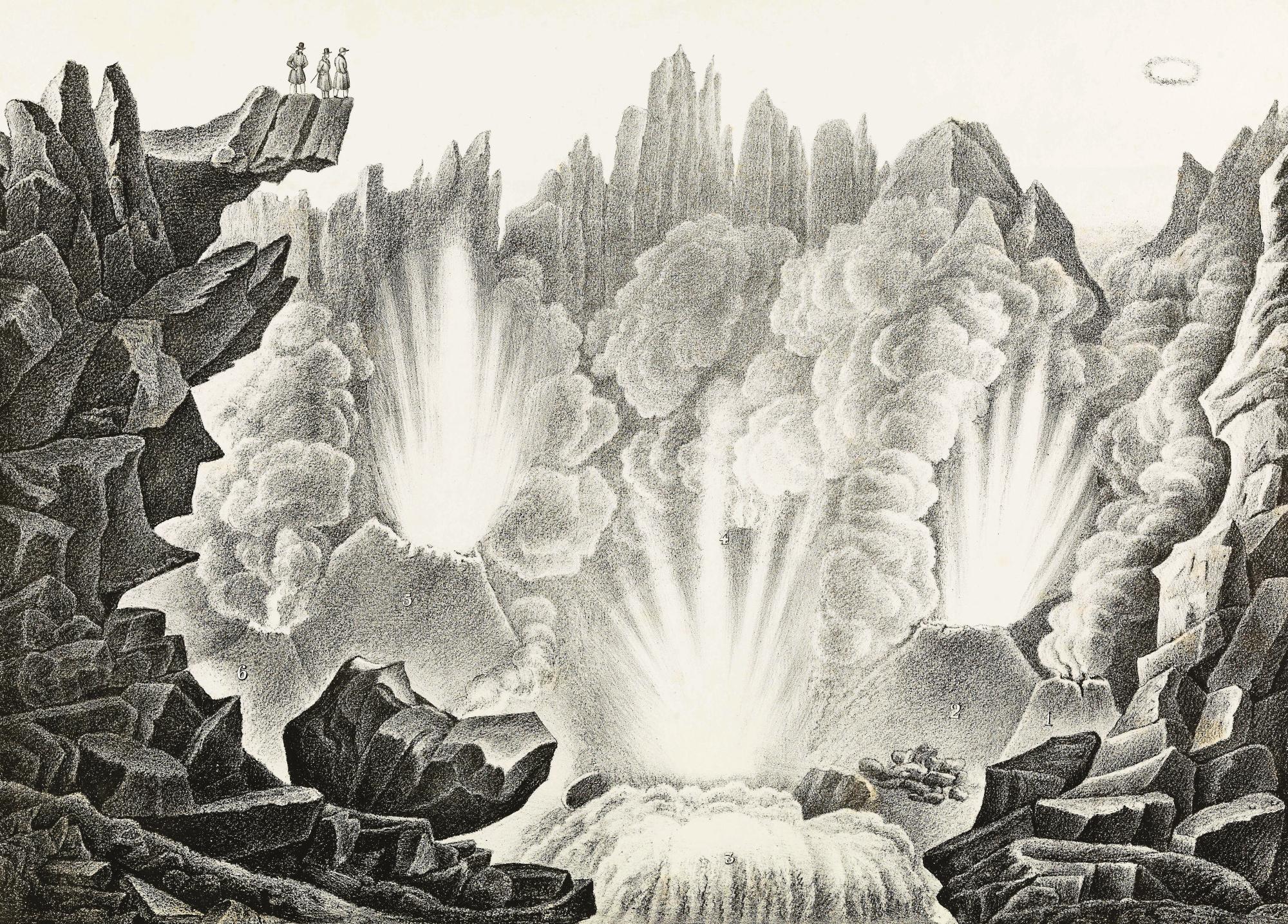 Count de Bylandt-Palstercamp used cut-away views of steaming craters to illustrate