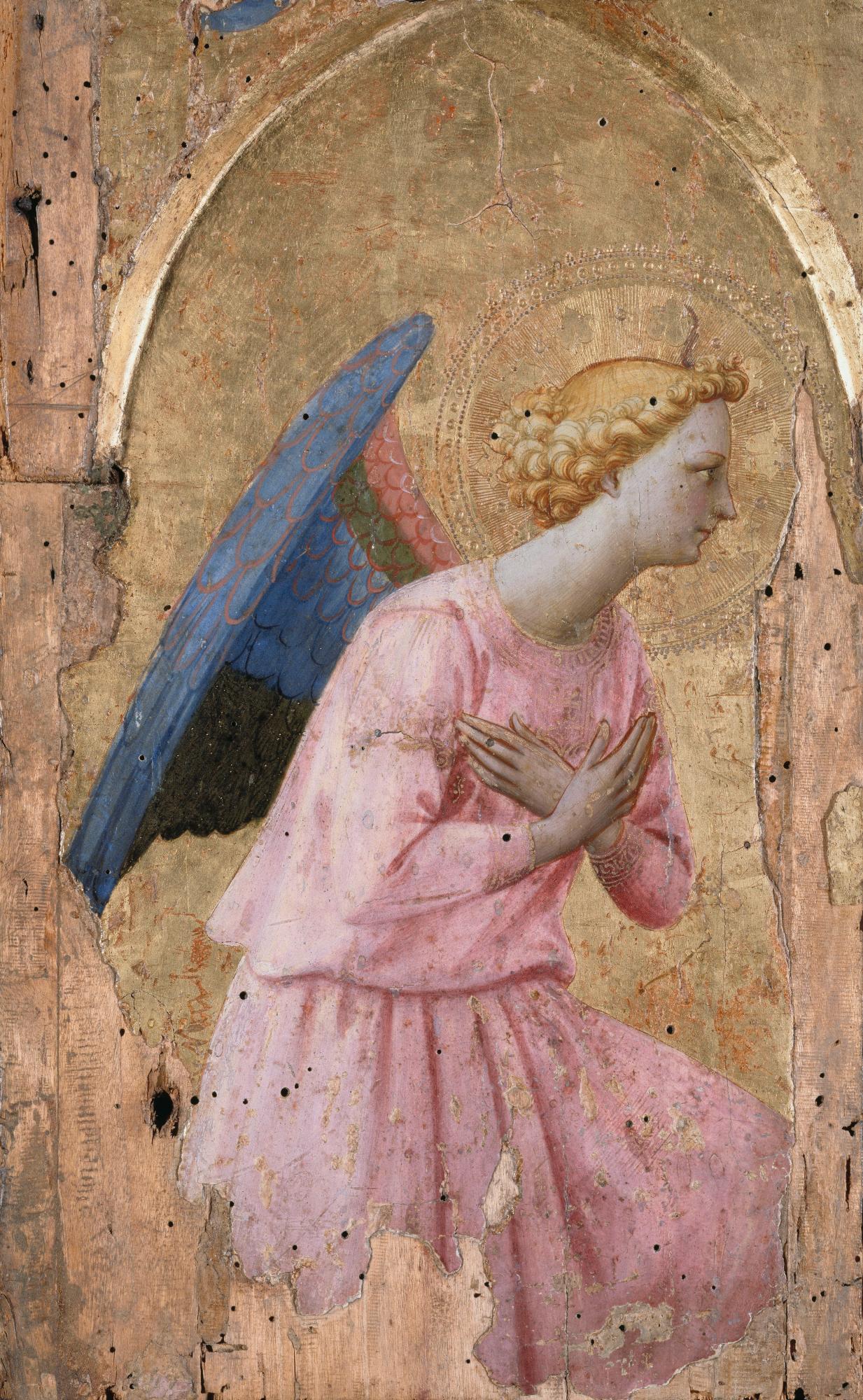 Este panel, junto al de Ángel en adoración, girado hacia la izquierda, formaron parte de los laterales de un cimborio, hoy fragmentado, que suele identificarse con uno que Vasari describiera en 1568 en el altar mayor de la iglesia de San Domenico en Fiesole, cerca de Florencia, frente a un tríptico de Fra Angelico cuyos principales elementos se mantuvieron siempre en el edificio. Un tabernáculo con las figuras de Cristo en bendición y seis ángeles (San Petersburgo, Ermitage) estuvo probablemente coloquado originariamente en el centro del cimborium.