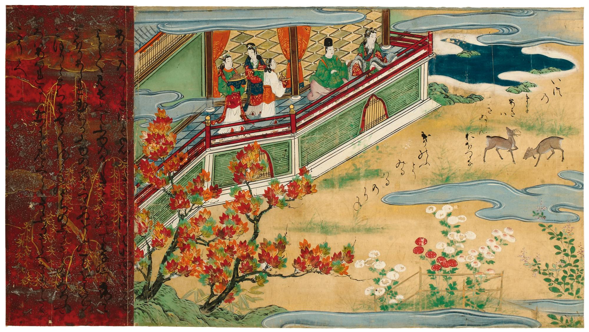 This is a fine example of a Japanese picture scroll, or emaki. It narrates a well-known folk tale. A fisherman, Urashima, is transported to a magic palace as the guest of Princess Otohime. From each of the four sides of the Princess?s palace there was a magical view of one of the seasons. The view from the south, shown here, was of spring. After several days Urashima returns to his village, only to find that many years have passed. On his leaving the palace the princess had given Urashima a mysterious box, which she had told him to keep closed. Forgetting her instructions, he opens the box and is immediately transformed into an old man. Emaki were made for the wealthy, and here a popular tale is given a markedly aristocratic treatment.