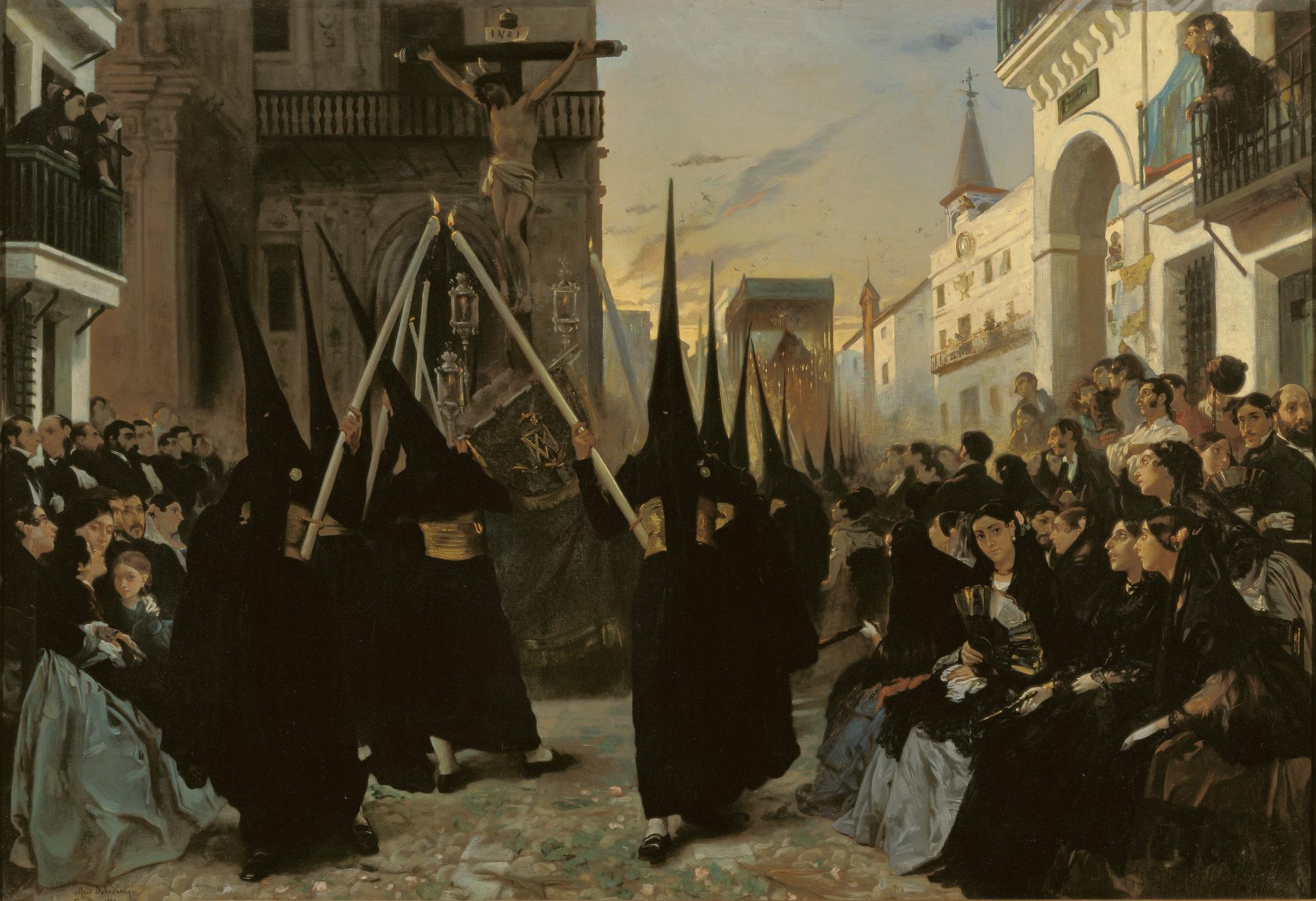 Première toile de Dehodencq montre une procession le long de la Calle Génova pendant les fêtes de Pâques à Séville. La route est emballé avec les gens pressés le long de la route pavée bordée par des rangées de femmes assises de statut social élevé sportives mantilles noires comme un signe de deuil pour la mort du Christ, accompagné de messieurs distingués prospectifs debout derrière eux. Deux rangées de membres de la confrérie dans les habitudes noirs portant des torches allumées à long escorter le char du Christ crucifié appartenant à leur fraternité, la bannière duquel l'un d'eux porte. Ils sont suivis en arrière-plan par l'image de procession de la Mater Dolorosa, éclairée par une masse de bougies et sous un dais, comme ce est caractéristique des images sévillanes de la Vierge.