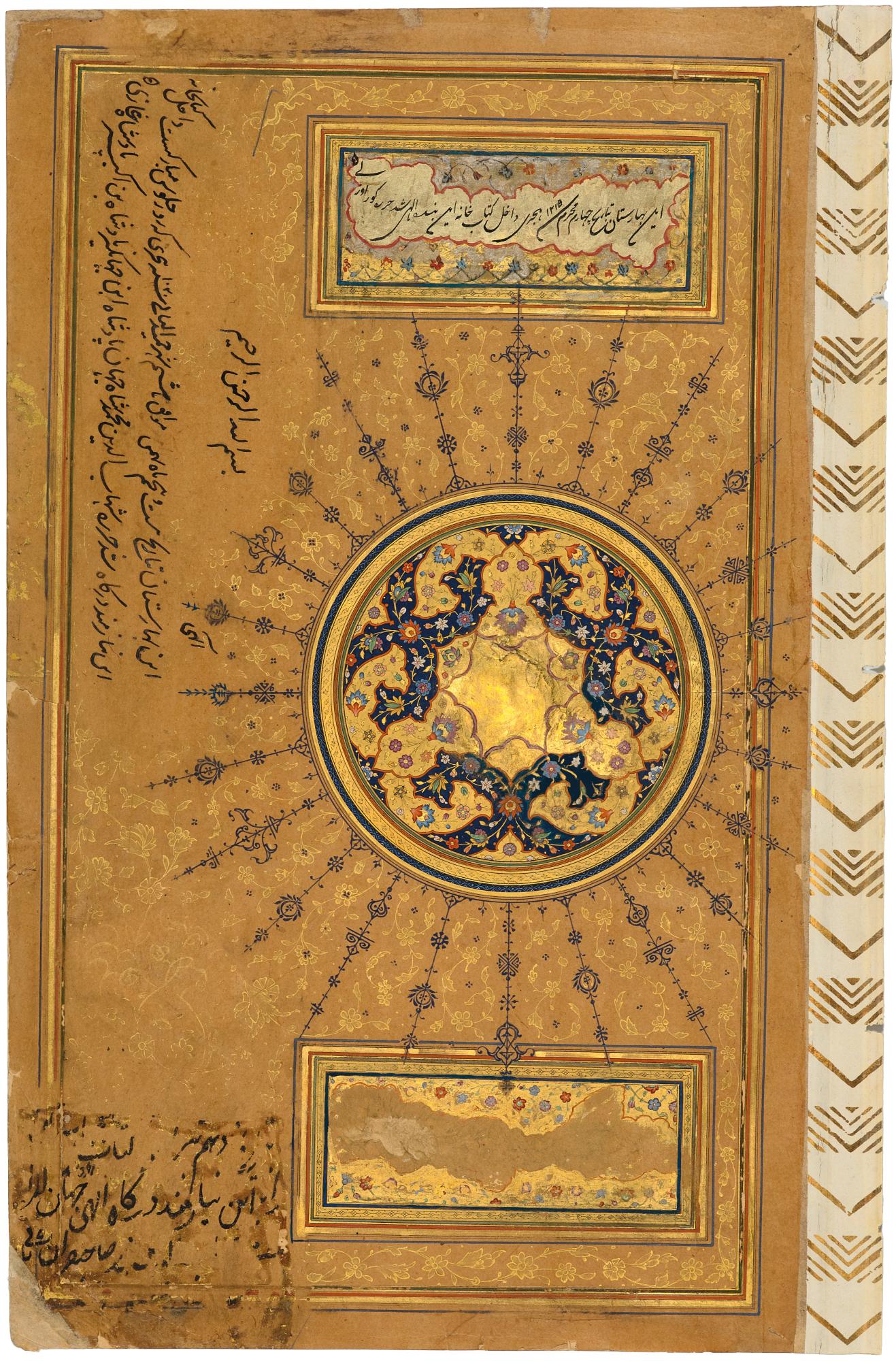 Under the patronage of the Emperor Akbar, miniature painting in Mughal India, and the associated arts of decoration and calligraphy, reached a high point. His court painters worked in the Persian tradition, but invested it with their own energetic Mughal style. Among the finest products of Akbar?s patronage is this superb manuscript (now disbound) of the Bah?rist?n (Garden of Spring), a fifteenth-century classic by the great Persian poet J?m?. The text was written in a beautiful nasta?l?q script by the great scribe Mu?ammad ?usayn, who held the title of Zar?n Qalam, or Pen of Gold. Specialist artists drew marginal figures, animals, birds and arabesques in gold outline on coloured paper. Illustrating scenes from the poem are six miniatures by the finest artists of the time.
